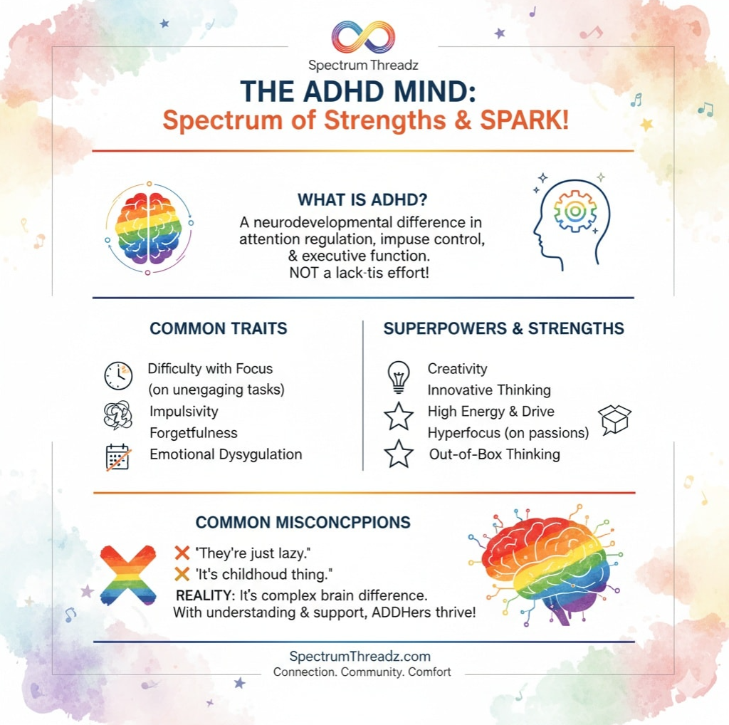 Attention-Deficit/Hyperactivity Disorder (ADHD) is a complex neurodevelopmental condition that affects how the brain manages executive functions, including attention, self-control, and impulse regulation. Like Autism Spectrum Disorder, ADHD is considered a part of neurodiversity, recognizing these differences in brain function as a normal human variation. It is a persistent, chronic condition that often begins in childhood and can continue through adolescence and adulthood.