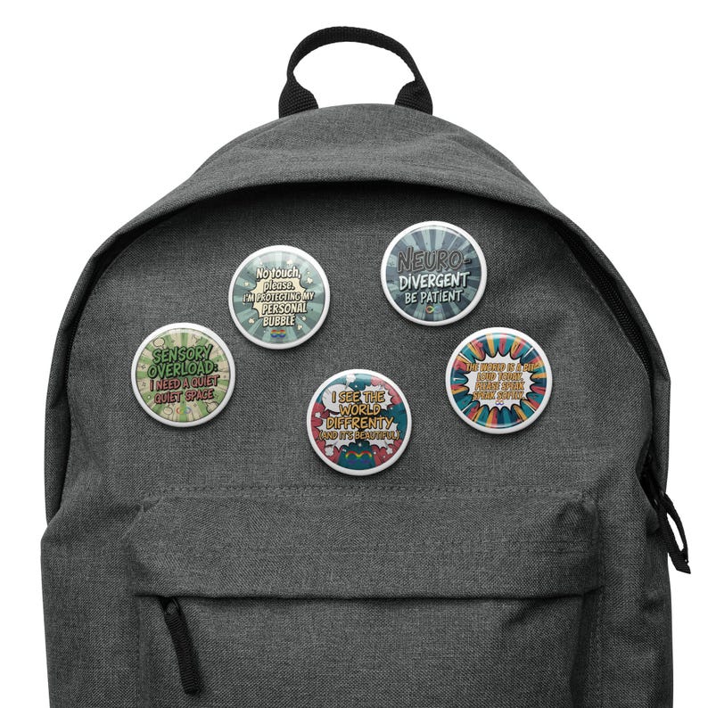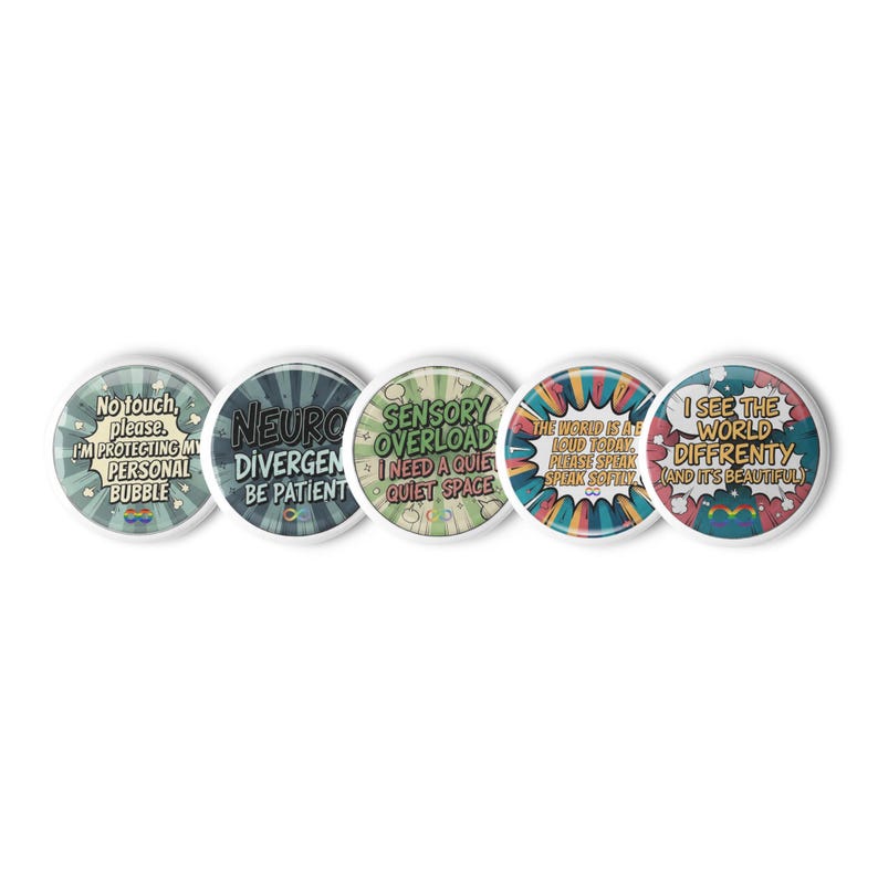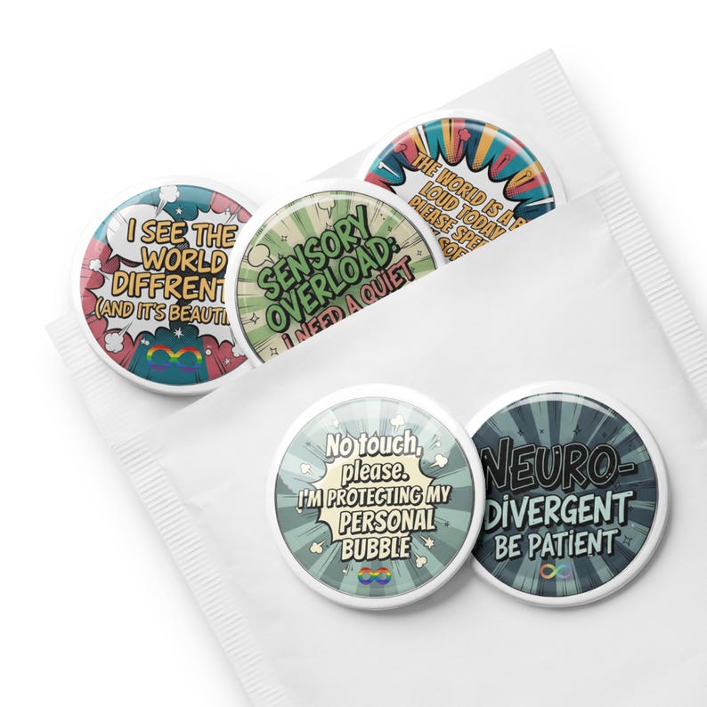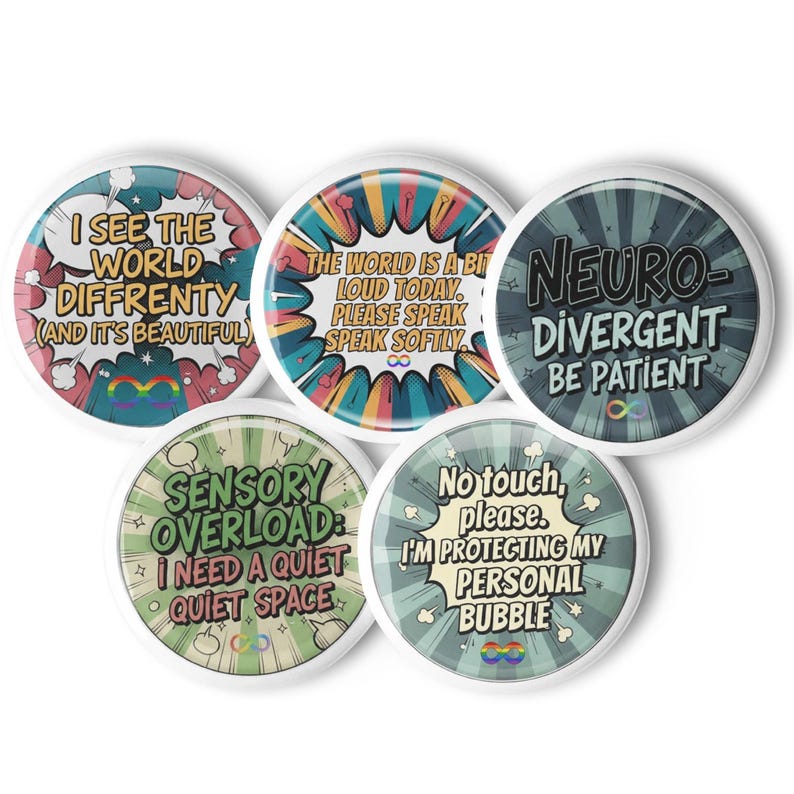 Celebrate your unique perspective with this set of five vibrant, comic-book-inspired pin badges designed specifically for the neurodivergent community. Each badge combines bold, fun aesthetics with practical messaging to help you navigate the world on your own terms.