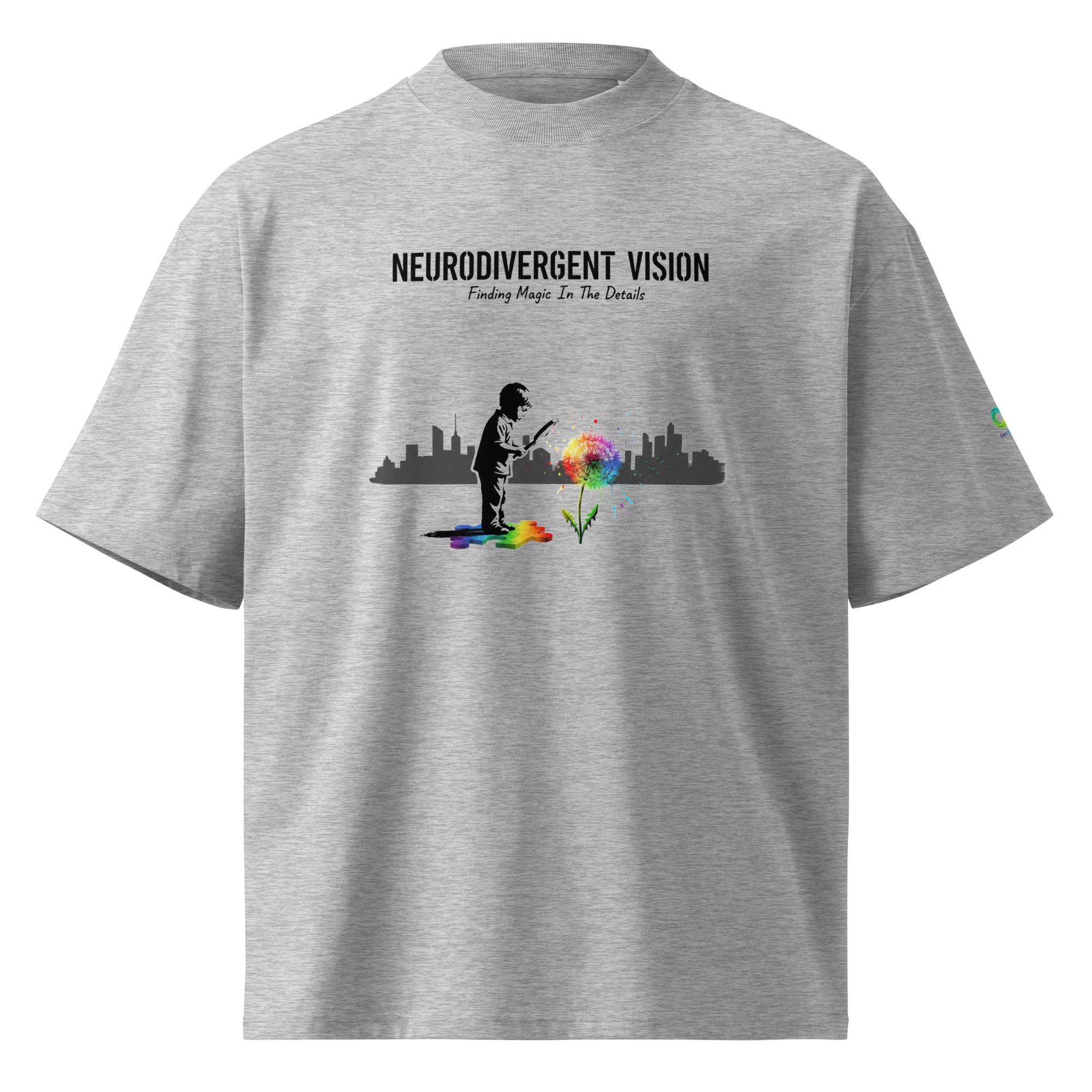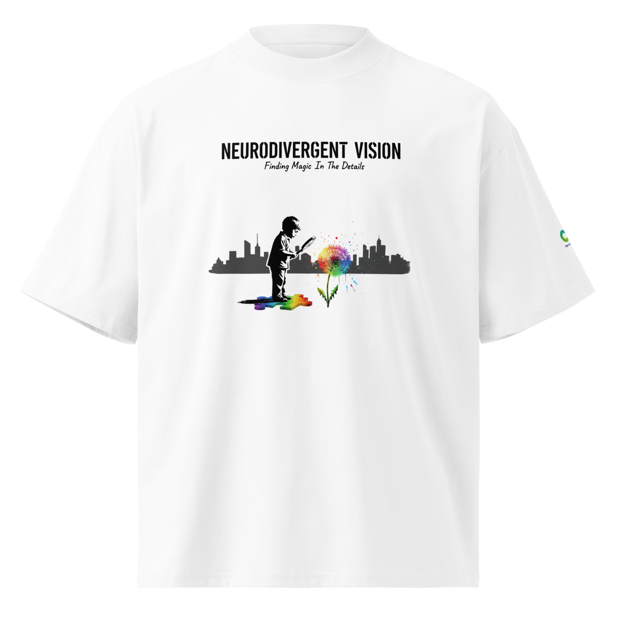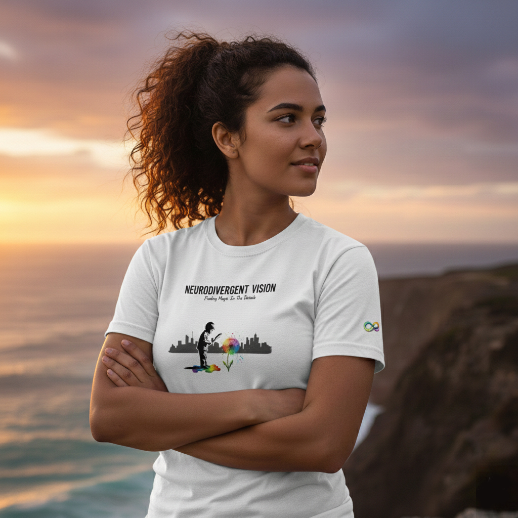 In a fast-paced world, it is a special gift to be able to pause and notice the tiny, vibrant wonders that surround us. This touching t-shirt honors that unique perspective with the phrase “Neurodivergent Vision: Finding Magic In The Details”. The artwork features a Banksy-style illustration of a child standing on a colorful puzzle piece, using a magnifying glass to discover a brilliant, rainbow-colored dandelion against a grey city skyline. It is a gentle reminder that sometimes, looking closer reveals the most color.