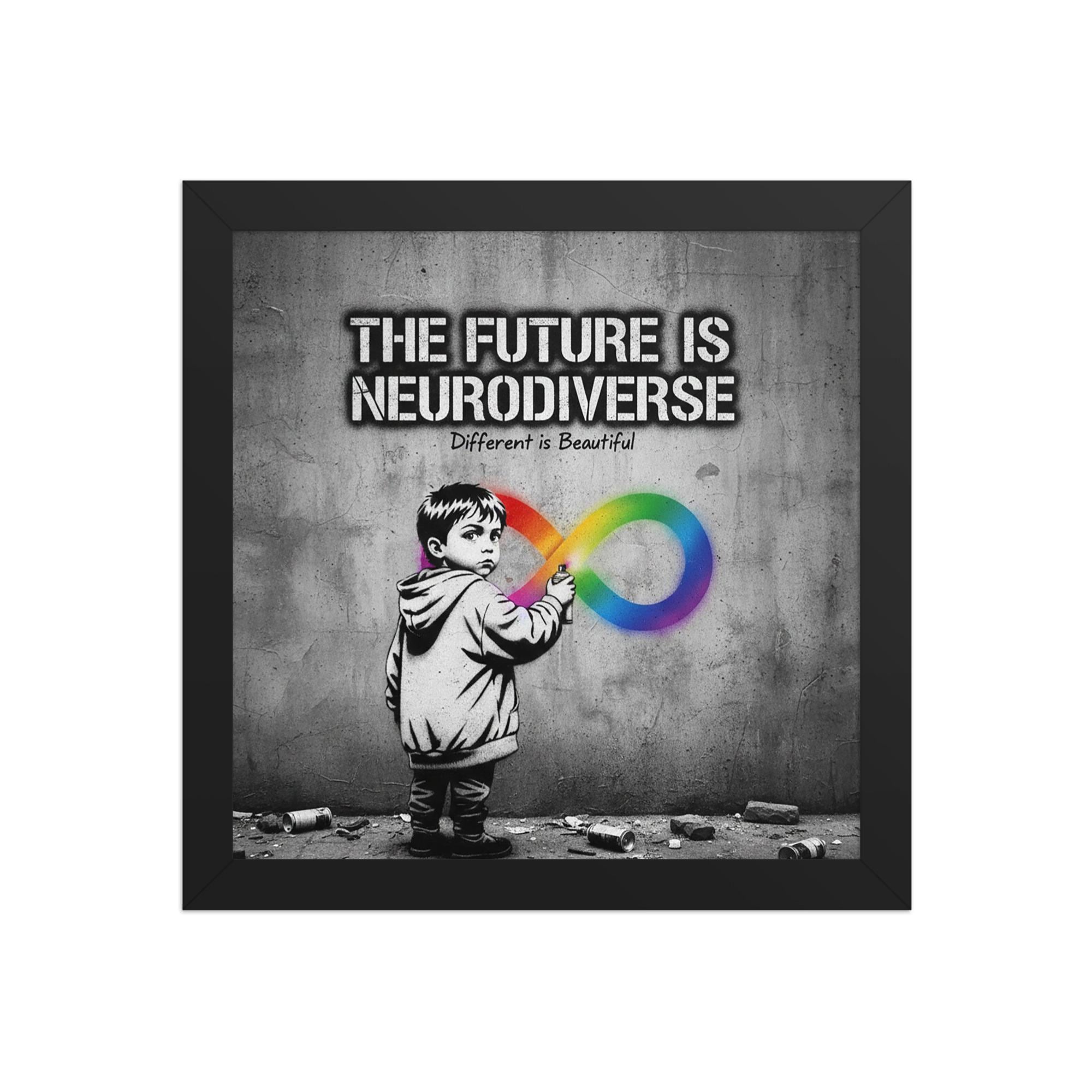 This emotional graphic features a young child holding a spray can, painting a vibrant, rainbow-colored infinity symbol (a sign of neurodiversity) onto a stark, monochrome wall. Above them, the powerful statement: “THE FUTURE IS NEURODIVERSE,” with the affirming subtitle: “Different is Beautiful.” This poster is a celebration of the next generation of thinkers, creatives, and innovators, emphasizing that divergent ways of processing the world are inherently valuable and beautiful. It’s a call for inclusion and a constant reminder of hope.