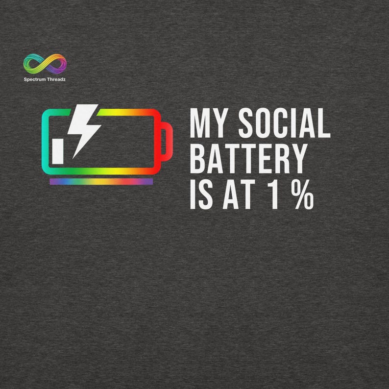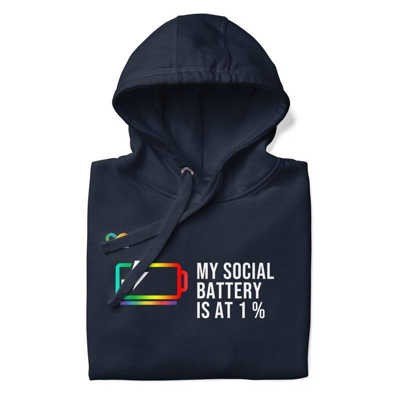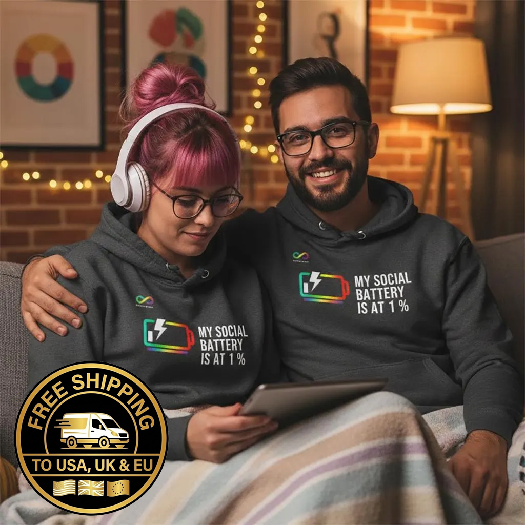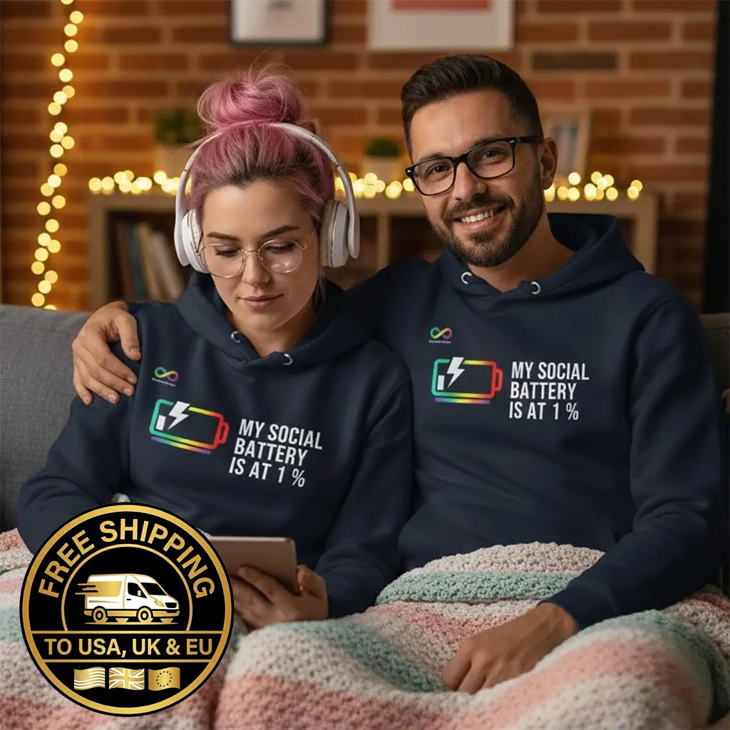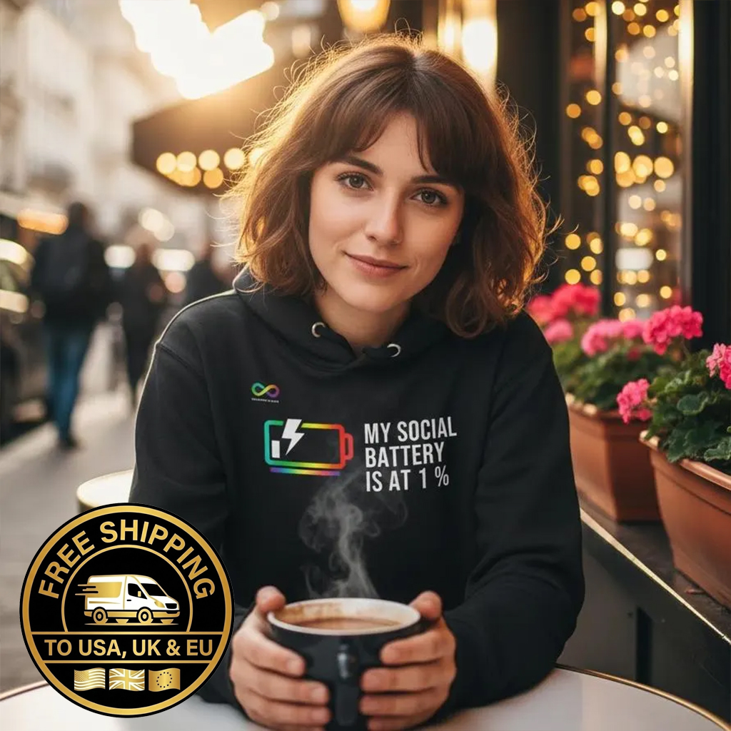 For many, social interactions and sensory demands can drain energy fast. Our “MY SOCIAL BATTERY IS AT 1 %” hoodie is a clear, visual, and authentic way to communicate that you are at your limit and need to step away to recharge.