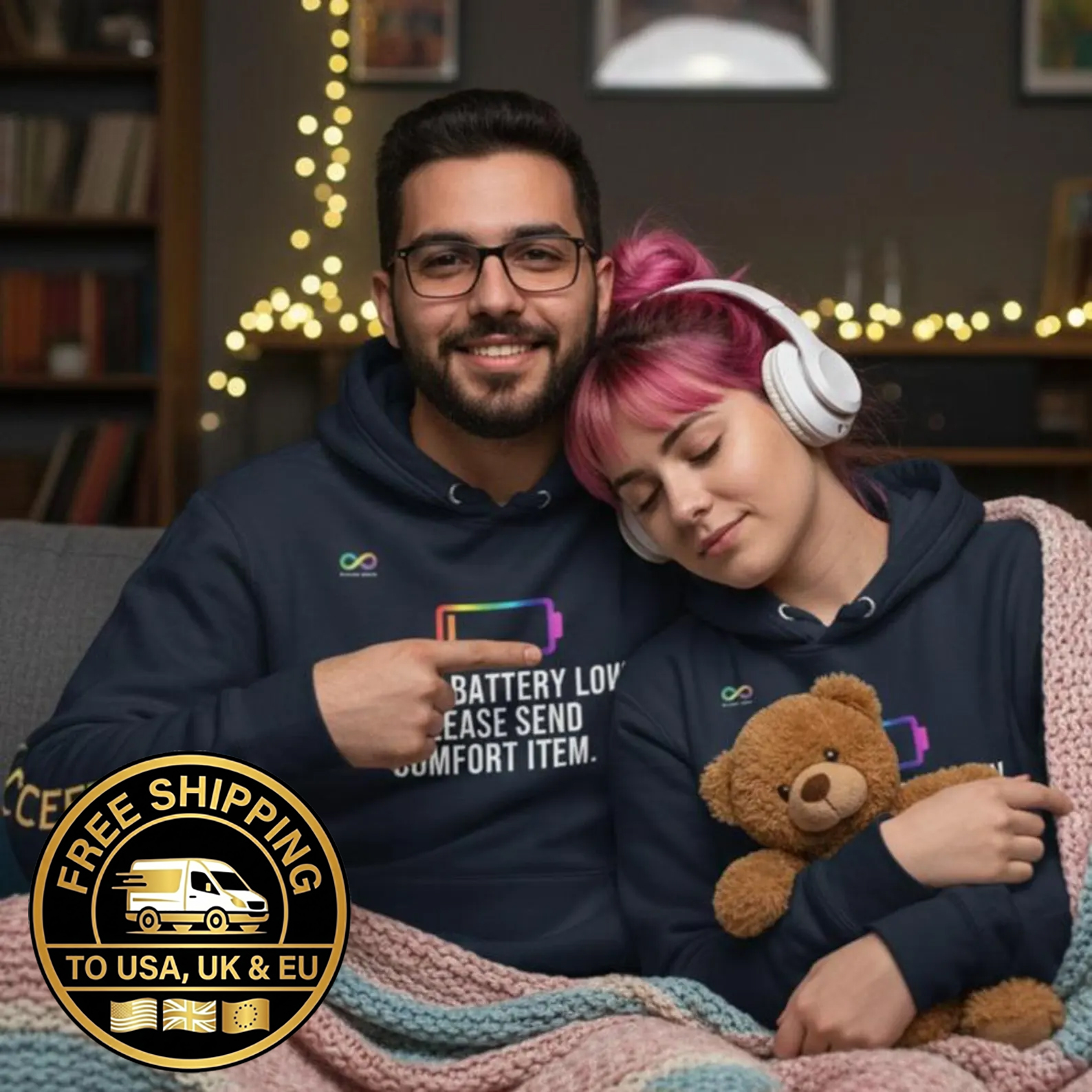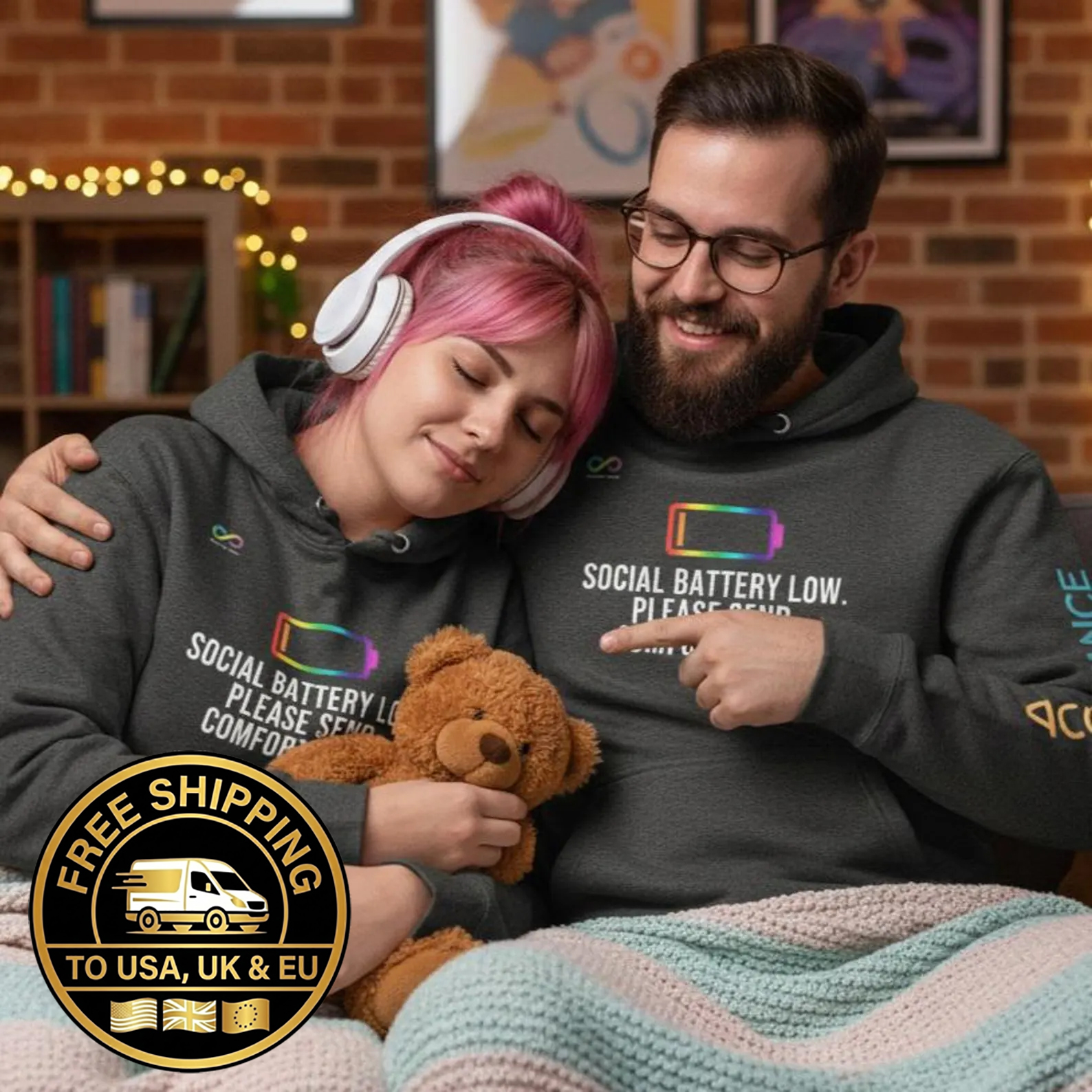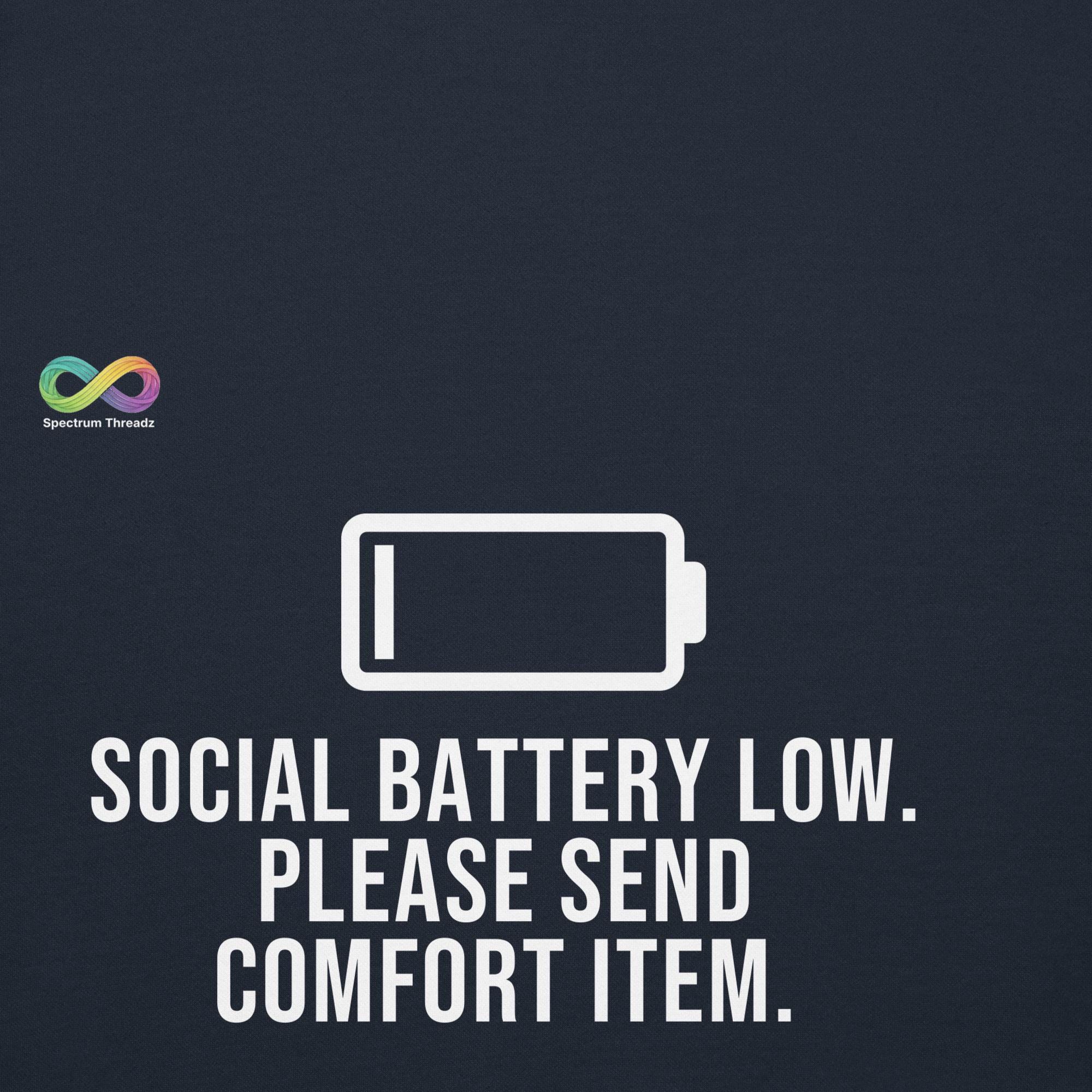 Our “SOCIAL BATTERY LOW. PLEASE SEND COMFORT ITEM.” hoodie acknowledges the genuine need for rest, solitude, and self-soothing that is common in the neurodivergent community (including Autistic individuals, those with ADHD, and highly sensitive people).