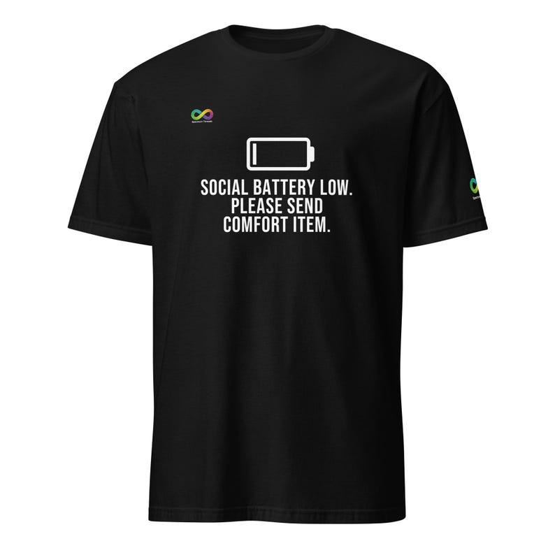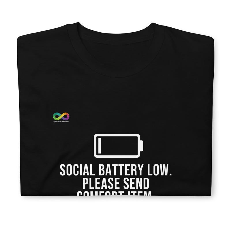 Introducing the perfect tee for anyone whose social energy bar runs low—or runs out completely! Our “SOCIAL BATTERY LOW. PLEASE SEND COMFORT ITEM.” T-shirt is a sincere and authentic way to communicate your need for space, rest, and sensory relief.